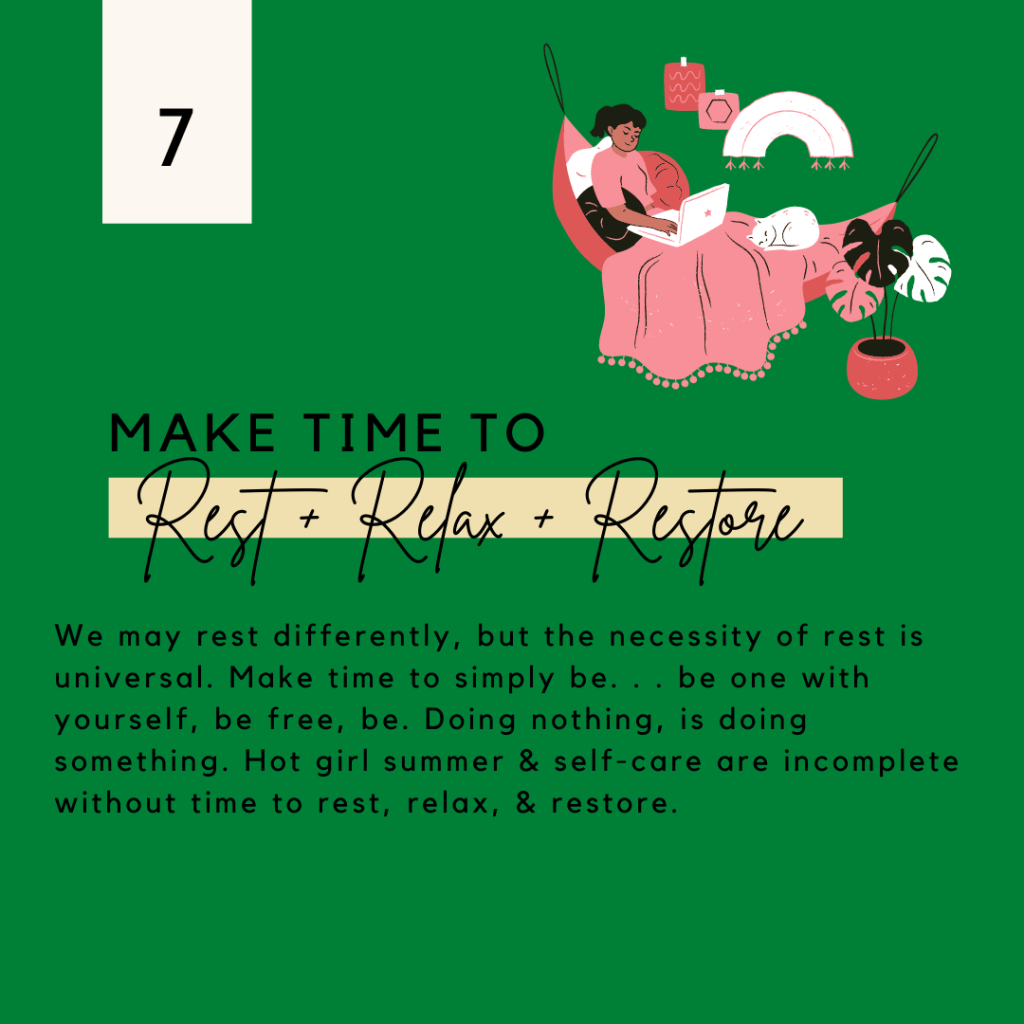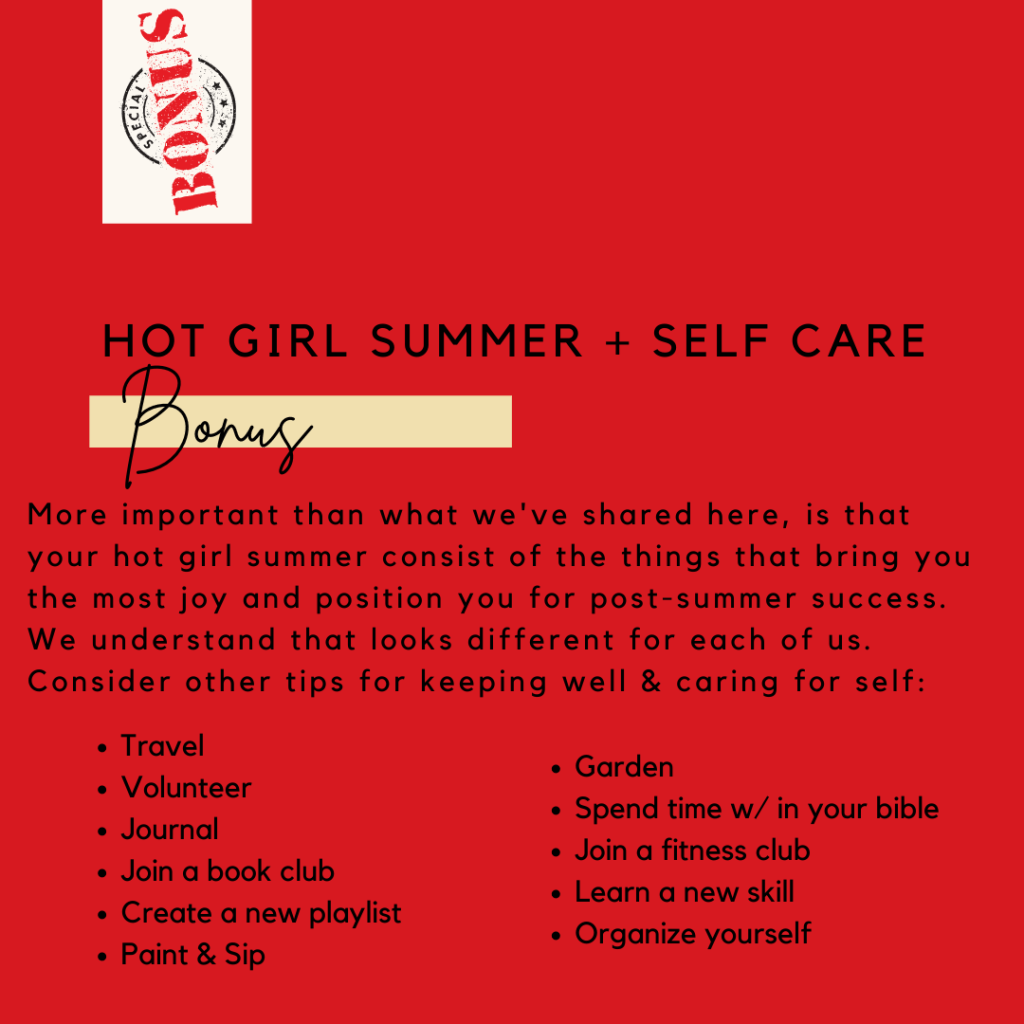 At Queens Do Things Inc. an effort to practice what is preached is always a top priority. We are therefore sharing this guide with women everywhere in hopes that we might all take a step closer to becoming the women that we are ordained to be. We hope that you’ll use this guide as a road map to building your own self-care routine for the summer. Social media has become a place where imbalance is easy. It is exhausting to virtually dwell in if you’re not careful. We wanted to provide a guide that encourages and reminds women everywhere to breathe, relax, progress and be. Self-care isn’t all about spa days and elaborate vacations. Sometimes self-care is saying no. Sometimes self-care is setting boundaries with the people around you. Sometimes it’s getting selfish with yourself. I couldn’t imagine a Hot Girl Summer without happiness & I can’t imagine true happiness without self-care.